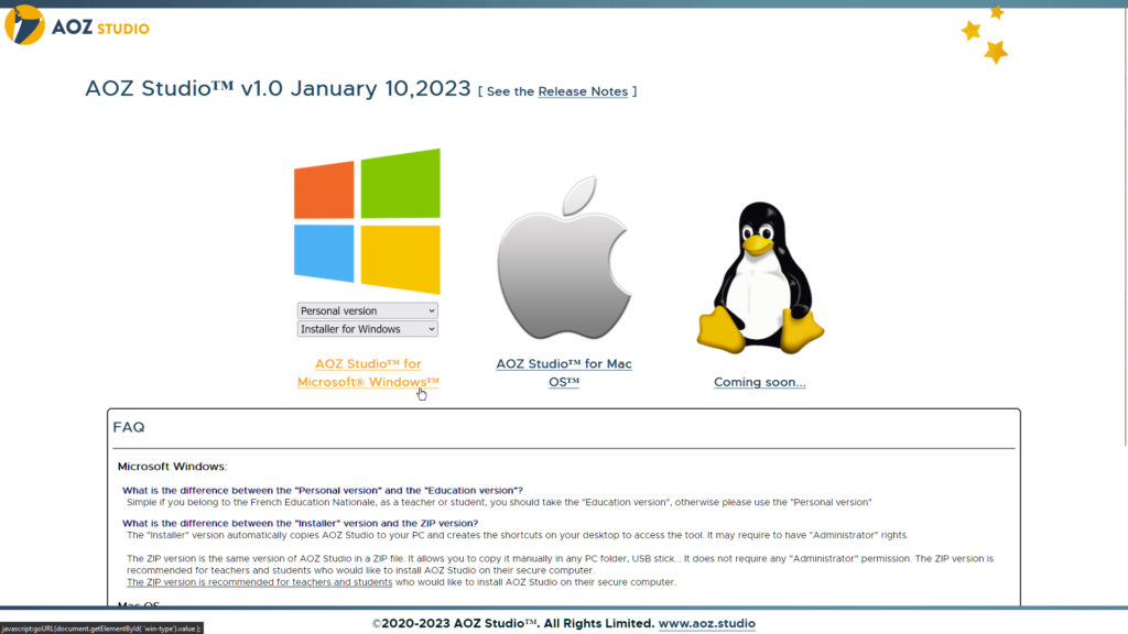 Es stehen zu Zeit Versionen für Windows und Mac zum Download auf der Webseite von AOZ Studio™ zur Verfügung. Auf der AOZ Studio™ Free Download Seite die Windows oder die Mac OS™ Version auswählen (Installer oder Zip bei Windows). Dann auf AOZ Studio™ for Microsoft Windows™ oder auf AOZ Studio™ für Mac OS™ klicken um den download zu starten.