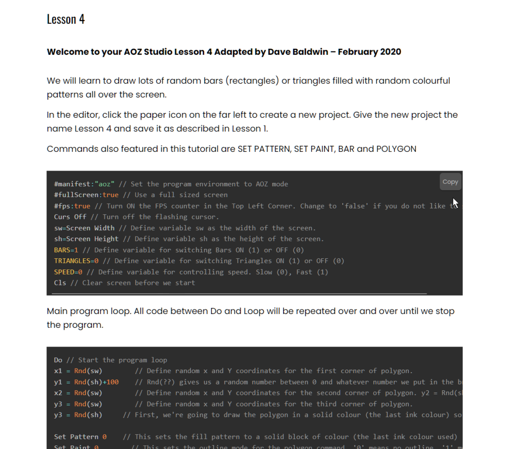 Learn how to use AOZ Studio™ and the Print, Locate, Input, Pen, End, For-Next and Wait commands