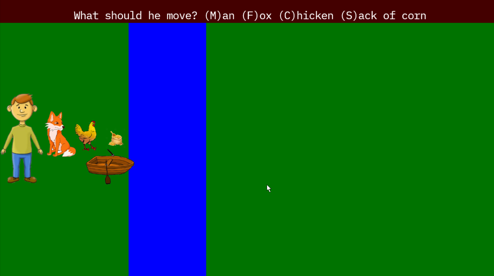 When All$ is printed it will look like this: “What should he move? (M)an (F)ox (C)hicken (S)ack of corn”.